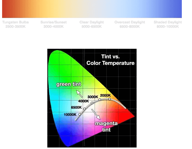 在某些光源中,光靠色溫也并不能完全的展現(xiàn)出色偏,還需要色彩的校正。與色溫所表示的暖度與冷度相似,色調(diào)通常是在品紅與綠色之間轉(zhuǎn)換。